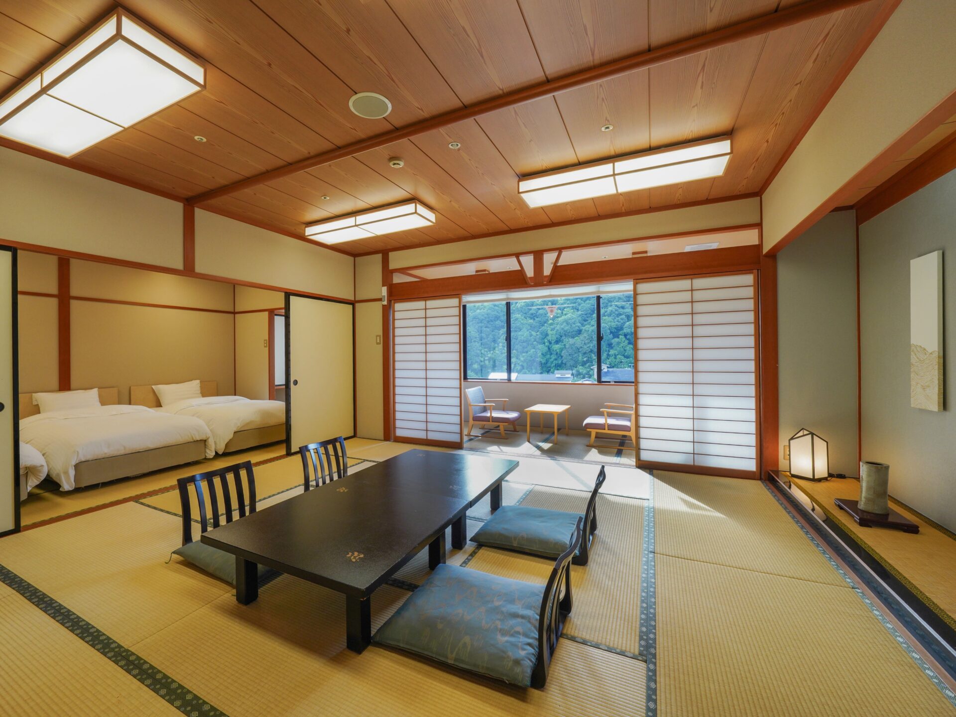 ベッドを3台配したお部屋や日本庭園が